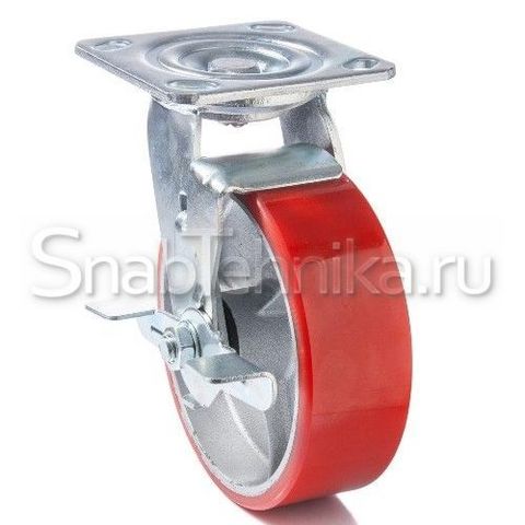 Поворотная колесная опора, большегрузное поворотное колесо с тормозом SCpb 200. Обод литой чугун, шинка из полиуретана. Диаметр колеса 200 мм. Кронштейн из оцинкованной листовой стали. Платформенное крепление. Колесо оснащено роликовым (игольчатым) подшипником с пыльниками и бесшовной втулкой, а так же пресс-масленкой (тавотницей). Используется большегрузная колесная опора в промышленности, для перемещения грузов весом до 400 кг, в расчете на одно колесо. Применяется на передвижном оборудовании со стандартной и усиленной нагрузкой - различные тележки, мусорные баки, вышки туры и т.п. Обеспечивают надежную эксплуатацию промышленного, складского, хозяйственного оборудования при больших и средних нагрузках, на любых полах и дорожных покрытиях.