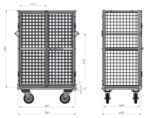 Заполнение бортов и створок дверей — сетка с ячейкой 50×100×3,0 мм. Сетка изготовлена на высокоточном сварочном оборудовании с системой ЧПУ. Створки дверей фиксируются и снабжены проушинами для навесного замка. Площадки для крепления колес универсальные и рассчитаны на диаметр колес от 125 до 200 мм.