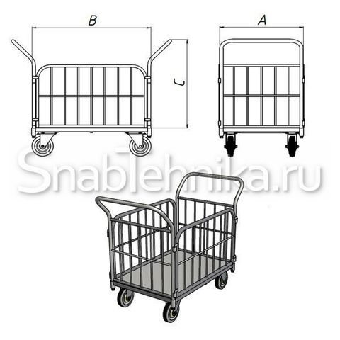 Предлагаются различные модификации тележек данной модели со следующими параметрами: грузоподъемность от 300 до 600 кг, ширина платформы (А) от 500 до 800 мм, длина платформы (В) 800 до 1400 мм, высота тележки без колес (С) 720 мм, высота бортов 500 мм. Высота платформы с разложенными ручками (без колес) 720 мм.