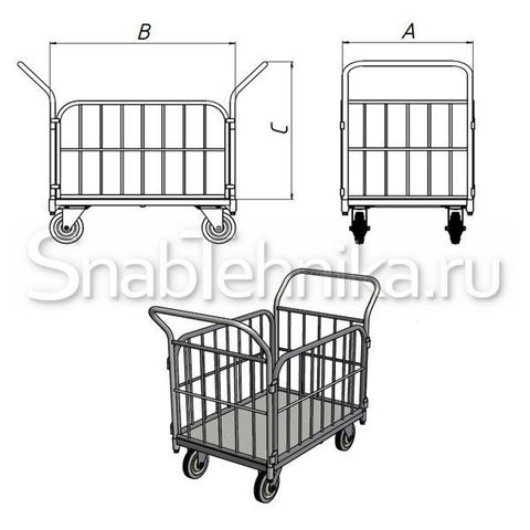 В комплекте: 2 рукояти, 2 поворотных, 2 неповоротных колесных опоры. Тележка может комплектоваться колесами диаметром: 125 мм (грузоподъемность 300 кг), 160 мм (г/п 450 кг), 200 мм (г/п 550 кг), 250 мм (г/п 600 кг). Возможна установка 4-х поворотных колесных опор, с целью повышения маневренности тележки. Высокие борта и наличие двух ручек делают тележку данной модификации более практичной в использовании. Ее можно как тянуть, так и толкать, не разворачивая, реверсивно менять направление движения, что очень удобно при эксплуатации в узких проходах.