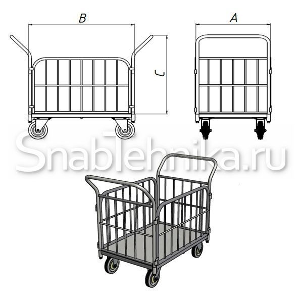 Служит для транспортировки товаров в мелких и крупных логистических центрах. Высокие борта (500 мм.) и наличие двух ручек повышают уровень удобства тележки в эксплуатации.