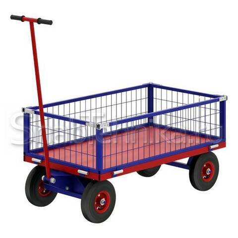Тележка платформенная с поворотной осью ТПОБ С. Выполнена на базе ТПО. Платформа плоская. Все борта имеют систему навесов, позволяющих осуществлять быструю установку и съем, снабжены оцинкованными фиксаторами, высота бортов 300 мм, заполнение сетка 50х100. Для удобства перемещения рукоятка оснащена резиновыми ручками и пружинным узлом, который переводит ручку в вертикальное положение.